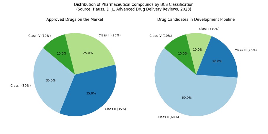 The available data speaks for itself: 35% of drugs approved today belong to BCS class II, which means they are poorly soluble in aqueous environments but have good permeability. In the development pipeline, this figure is even more dramatic: 60–70% of all drug candidates have poor solubility.